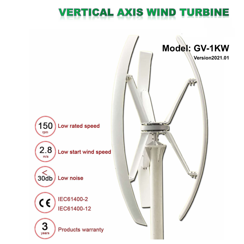 The GV-1KW is a cutting-edge vertical axis wind turbine designed for efficient and reliable power generation. It utilizes a unique “Precise Coll” technology, eliminating the need for traditional hysteresis and gear mechanisms, resulting in higher efficiency and lower maintenance. The turbine incorporates a robust structure and a specially designed motor for optimal performance, delivering a high power-to-weight ratio. With a long lifespan and minimal maintenance requirements, the GV-1KW is a dependable and cost-effective solution for harnessing wind energy.