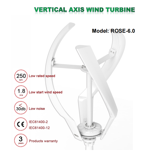 The ROSE-6.0 is a small-scale vertical-axis wind turbine (VAWT) designed for residential and commercial applications. It is known for its compact size, quiet operation, and ability to generate power in low wind speeds.